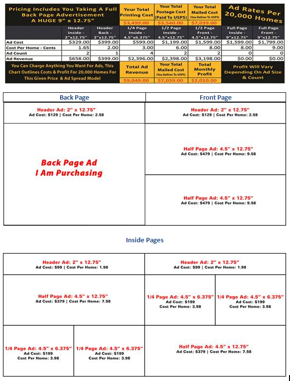 I have even negotiated a 1000 FREE Business Cards and a 1000 FREE 4x6 postcards for any advertiser doing a quarter page or larger advertisement. You only pay just $49.00 for S&H for the 2000 pieces. I was able to also get all Professional Graphic Design included at NO Charge. When using graphic artists in the past, that cost alone can get expensive. I will be sending out the piece monthly and will also vary where it goes based on your feedback and the feedback of the other advertisers. Please let me know what size ad you would like and I will then have the graphic artist contact you directly to get your advertisement created….they usually have proofs same or next day. The ad space available is the front and inside pages. Please let me know what areas you are most interested in advertising in as well. Please call me with additional questions. Thank you again for being part of this COOP Direct Mail Piece…I am very optimistic it will be something people will look forward to receiving every month and every advertiser will see a positive return on their investment. For payment, I have set up a pay pal account or happy to take a check as well. Thank you again for the opportunity to earn your trust & confidence!!! Sincerely, John Smith ABC Real Estate Company 123-123-1234 |